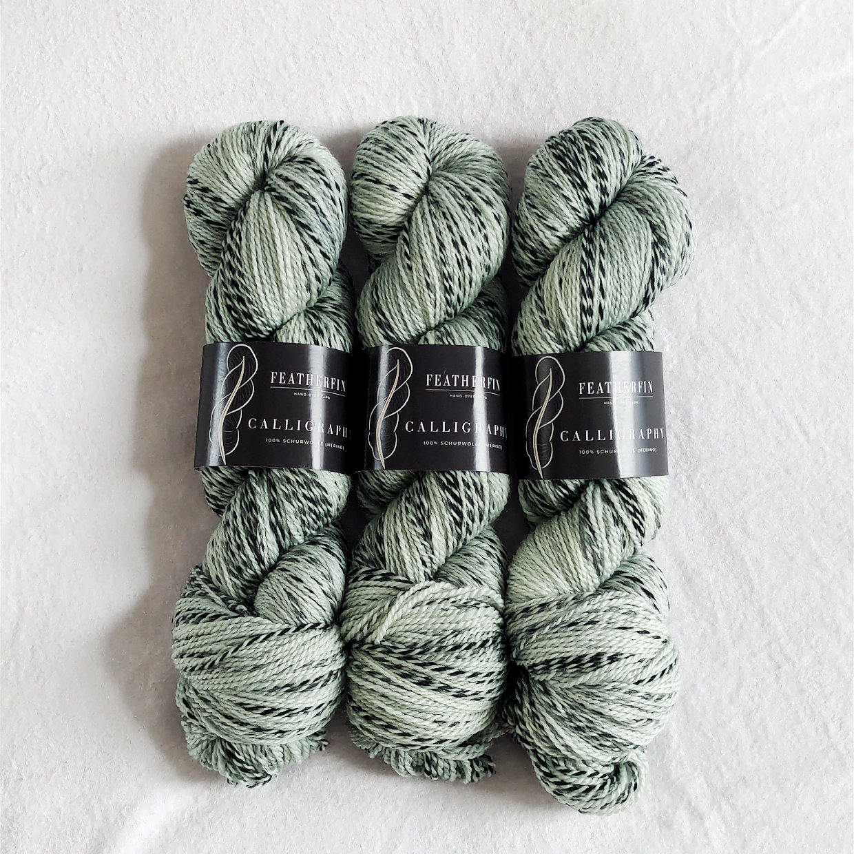 Calligraphy ist ein ungewöhnliches, 2-fädiges Fingeringgarn aus extrafeiner superwash Merinowolle. Eine der Fäden geht in verschiedenen Abständen in Schwarz über, so dass ein Streifenmuster entsteht, das sich ideal für ansonsten einfache Strukturen wie glatt rechts oder Krausripp eignet. Benutze ein oder zwei Fäden auf einmal für kuschelige Stirnbänder, Schals und Balaklavas.