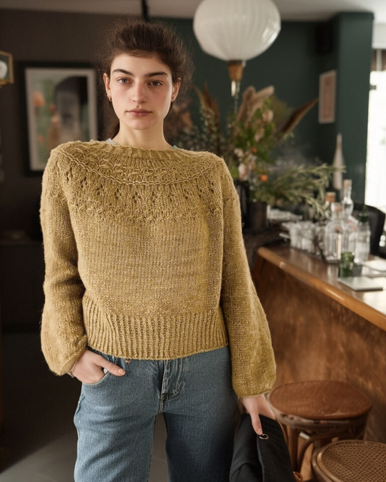 The Ranunculus sweater’s airy lace yoke glows beautifully in Gold — try it in Super Sock for a lightweight pullover, or add a strand of Kid Silk for extra halo and gentle structure.