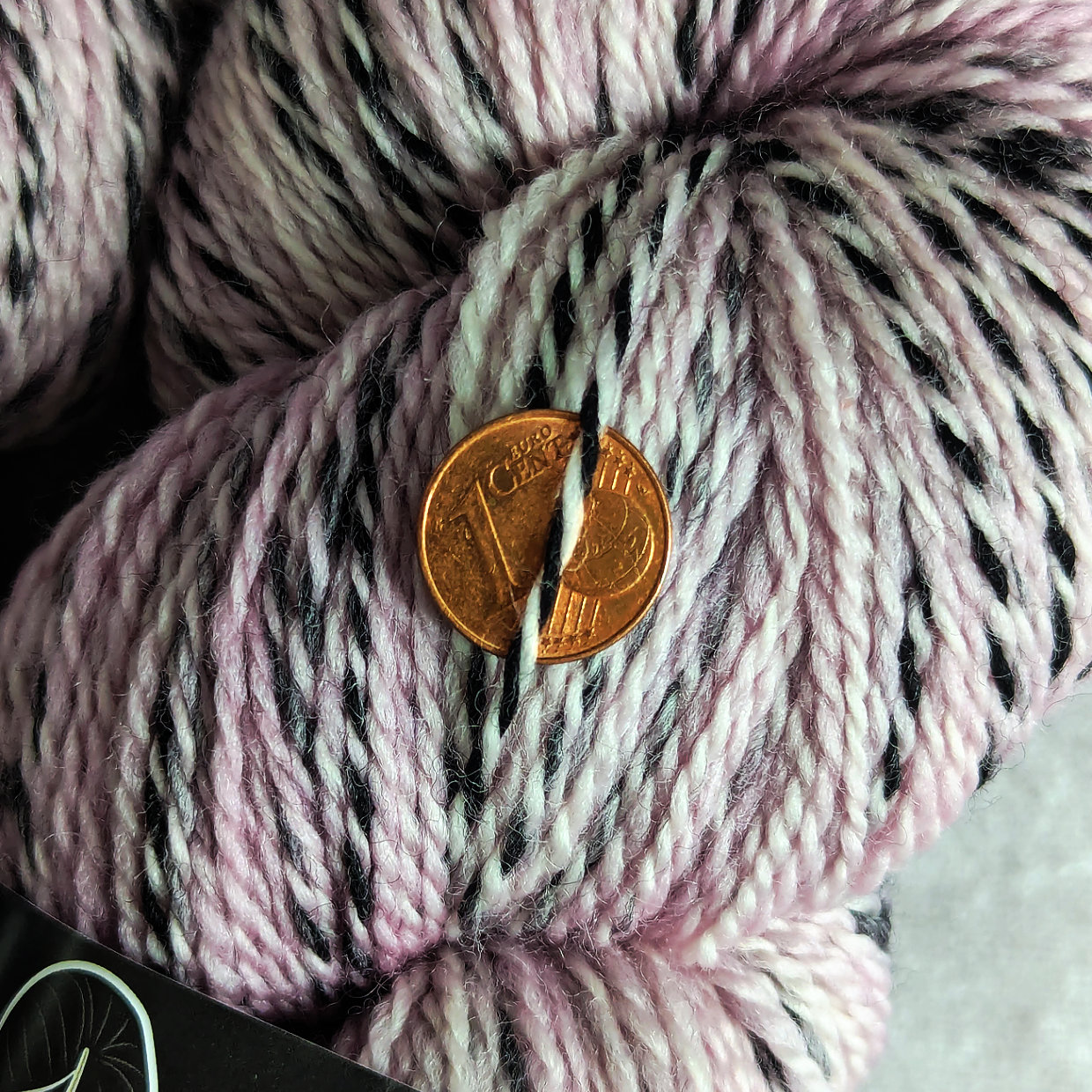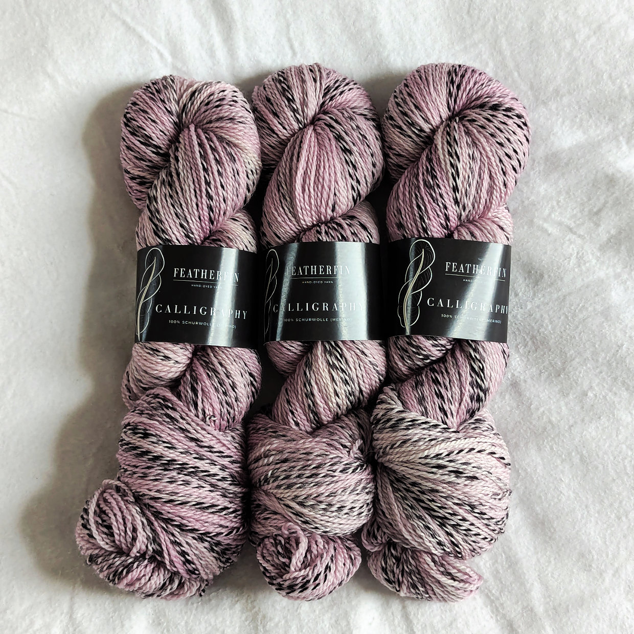 Calligraphy is a fun, 2-ply fingering yarn made from extra-fine superwash merino wool. One of the plies transitions to black at various intervals, resulting in a self-striping pattern that is ideal for otherwise simple textures like stockinette or garter stitch. Use one or two strands at a time for cozy headbands, cowls and cardigans.